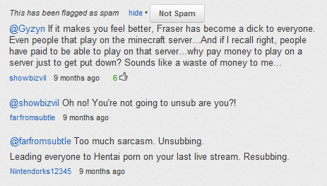 on Youtube, but the peanut gallery will usually say this during a live show and other sites without subscription systems, such as Blistered Thumbs. Usually fans during a live show will complain something ridiculous, such as "Not enough Simpsons quotes. UNSUBBING." Fraser had also said that at the time this joke was made, he looked it up and no one else had made the joke yet. Therefore, according to Fraser, the joke belongs to the VGA Live chat.